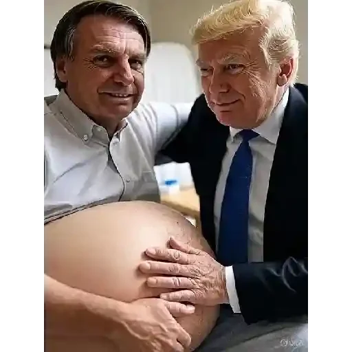 Dois homens, um com cabelo castanho e camisa branca e o outro com cabelo loiro e terno, tocam a barriga de um terceiro, que não é visível, com expressões faciais engraçadas.