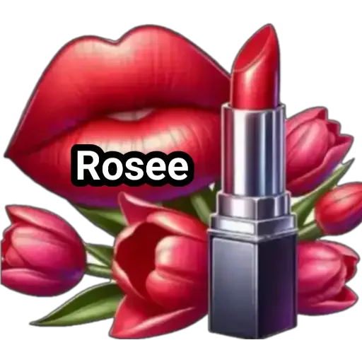 Um batom vermelho brilhante ao lado de lábios pintados de vermelho e tulipas vermelhas, com o texto 'Rosee' sobreposto aos lábios.