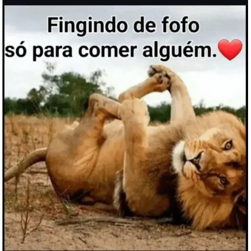 Um leão deitado de costas com as patas levantadas, com um texto que diz 'Fingindo de fofo só para comer alguém.' e um coração vermelho.