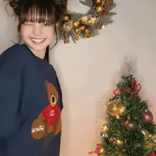Menina sorrindo ao lado de uma árvore de Natal decorada com luzes e enfeites, usando um moletinho com um ursinho.
