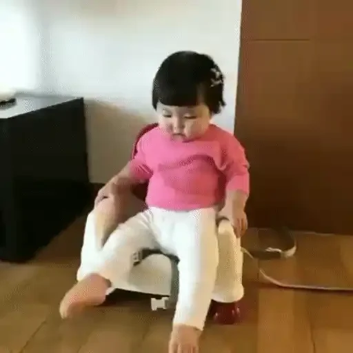 Menina sentada em uma cadeira, vestindo uma blusa rosa e calça branca, com uma expressão facial de surpresa ou susto.