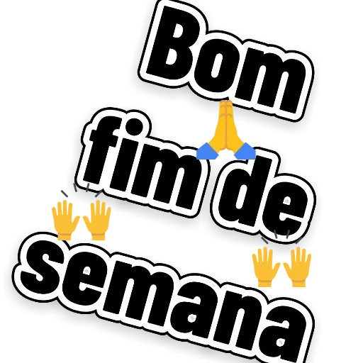 Um sticker com o texto 'Bom fim de semana' em letras grandes e pretas, com um desenho de um trombone amarelo e óculos azuis no meio, e mãos amarelas com dedos levantados dos dois lados.