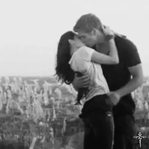 Um casal se beijando em preto e branco, com o homem de camisa preta e a mulher de camisa branca, em um cenário urbano ao pôr do sol.