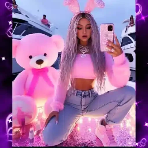 Uma jovem mulher com cabelo longo e rosa claro fazendo um selfie com um ursinho de pelúcia rosa gigante. Ela está usando uma roupa rosa e calça jeans.