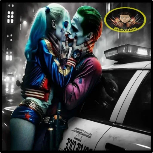 Joker e Harley Quinn se beijando, com maquiagem colorida e expressões alegres. O Joker tem um sorriso largo e dentes…