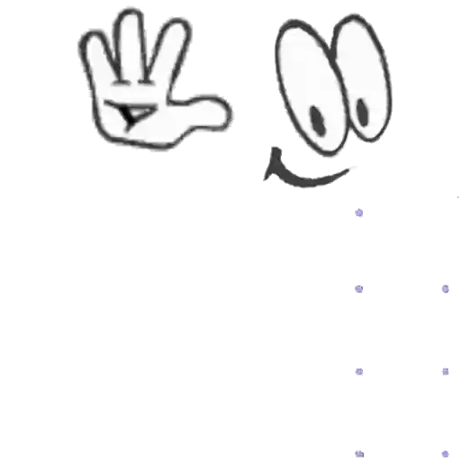 Um desenho simples de uma mão fazendo um gesto com três dedos e um rosto cartoon com olhos grandes e sorriso.