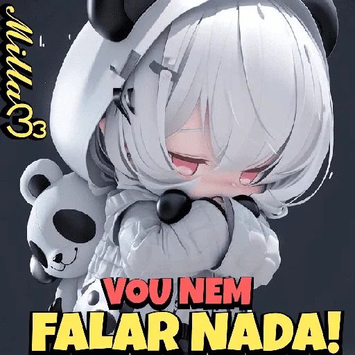 Uma menina de anime com cabelo branco e olhos rosados, vestindo um traje branco com detalhes pretos, abraçando um ursinho panda. Ela parece dormir ou descansar. Abaixo dela, está escrito 'VOU NEM FALAR NADA!' em letras coloridas.