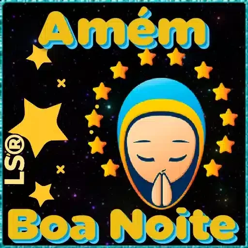 Um desenho de uma pessoa com as mãos juntas em oração, usando um capuz azul e amarelo, rodeado de estrelas amarelas no céu noturno. A imagem traz o texto 'Amém Boa Noite'.
