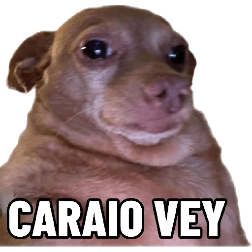 Um cachorro com expressão cômica e o texto 'CARAIO VEY' em letras grandes e brancas.