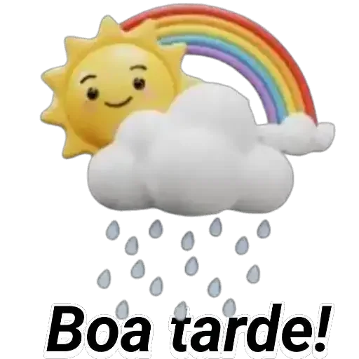 Um sol amarelo com um sorriso está em cima de uma nuvem branca com gotículas de chuva caindo. Um arco-íris colorido sai do sol. Abaixo, o texto 'Boa tarde!' aparece.