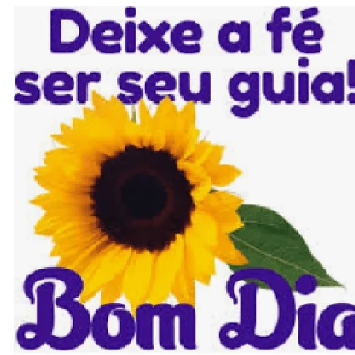 Uma flor de girassol com uma folha verde ao lado, com o texto 'Deixe a fé ser seu guia!' e 'Bom Dia' em letras roxas.
