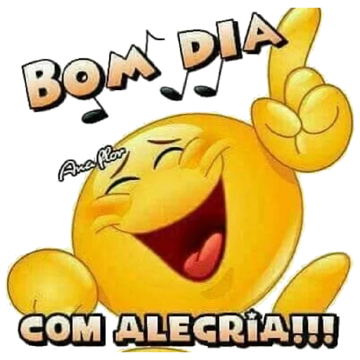 Um emoji amarelo sorridente com a mão levantada e os dizeres 'Bom Dia Com Alegria!!!'