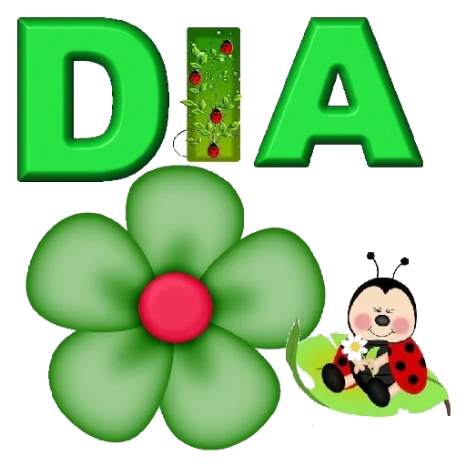 Uma figurinha com a palavra 'DIA' em letras grandes verdes, uma flor verde com centro rosa e uma ladybug sentada em uma folha ao lado.