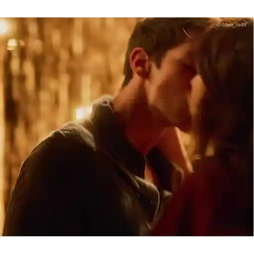 Um casal se beijando, com o homem de um lado e a mulher do outro, ambos com expressões românticas, em um ambiente com luzes quentes ao fundo.