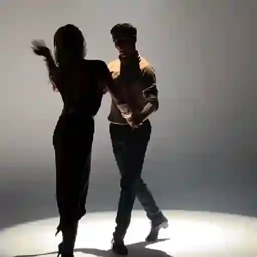 Silhuetas de um casal dançando em um palco iluminado, com o homem sem camisa e a mulher com um vestido, ambos em uma pose de dança.