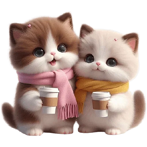 Dois gatinhos fofos vestindo cachecóis coloridos e segurando xícaras de café. O gato à esquerda tem pelagem castanha e branca e um cachecol rosa, enquanto o gato à direita tem pelagem branca e um cachecol laranja.