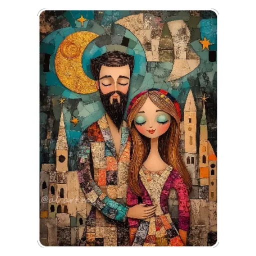 Um casal abraçado em frente a uma cidade com igrejas, com uma lua cheia amarela e uma meia-lua no céu.