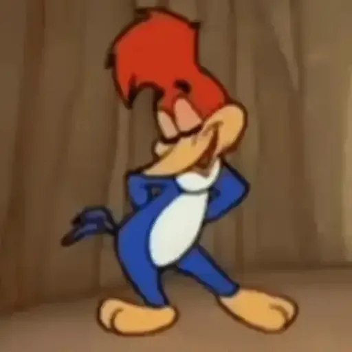 Um desenho animado de um pica-pau com penas vermelhas e corpo azul, com uma expressão facial engraçada e pose dançante.