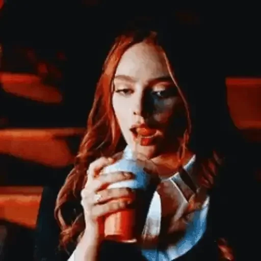 Uma jovem com cabelos castanhos e expressão de desinteresse ou tédio, vestindo uma blusa roxa.