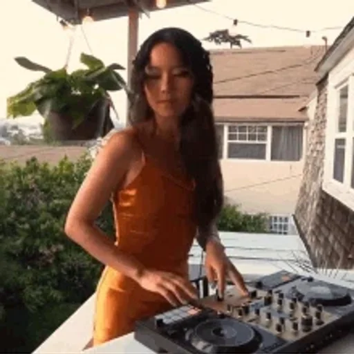 Uma mulher jovem com cabelo castanho e vestido laranja usando um equipamento de DJ em uma mesa branca ao ar livre.