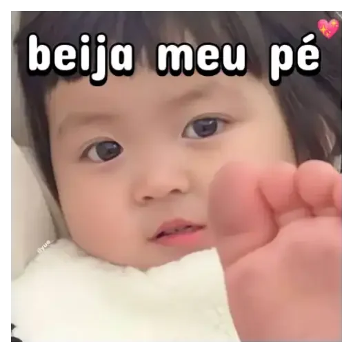 Um bebê com expressão curiosa e um pé levantado, com o texto 'beija meu pé' em cima.