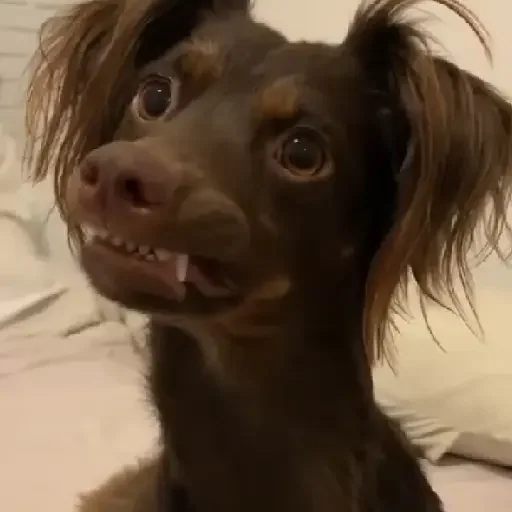 Cachorro com expressão surpresa, de olhos arregalados e dentes aparentes, com pelos castanhos e orelhas grandes.