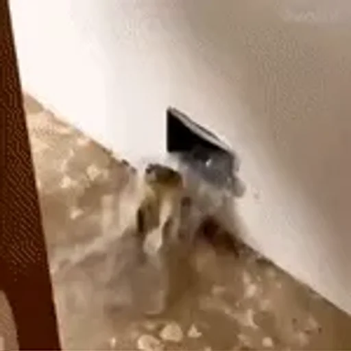 Um buraco na parede com água saindo, fundo de madeira e piso molhado.