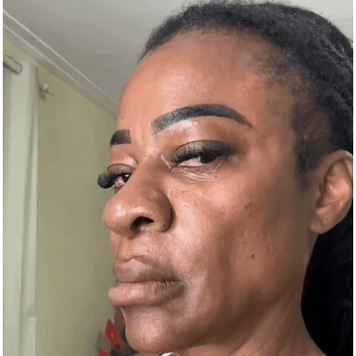 Rosto de uma mulher negra com makeup, olhando para o lado com uma expressão séria.