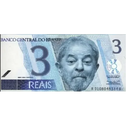Cédula de 3 reais com rosto de homem, Banco Central do Brasil, número 3 destacado.