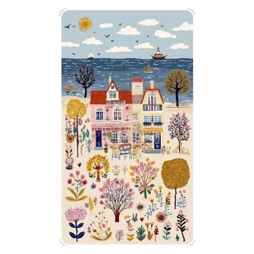 Uma cena colorida de uma cidade litorânea com casas rosadas, árvores e flores. O céu é azul com nuvens brancas e o sol brilha no canto superior esquerdo.