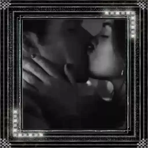 Um casal se beijando em preto e branco, com um quadro decorativo ao redor. A mão da pessoa à esquerda está no rosto da outra.