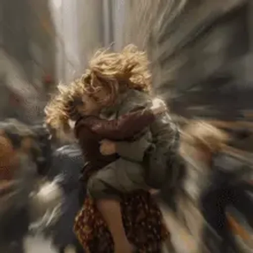 Mulher loira abraçando alguém em um ambiente urbano movimentado, com expressão de carinho e proximidade.