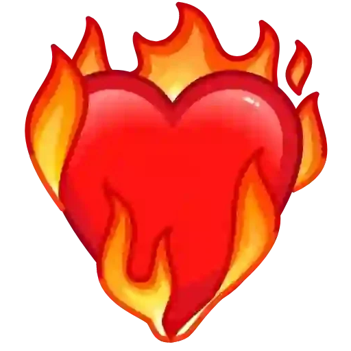 Coração vermelho em chamas com fogo laranja e amarelo ao redor.