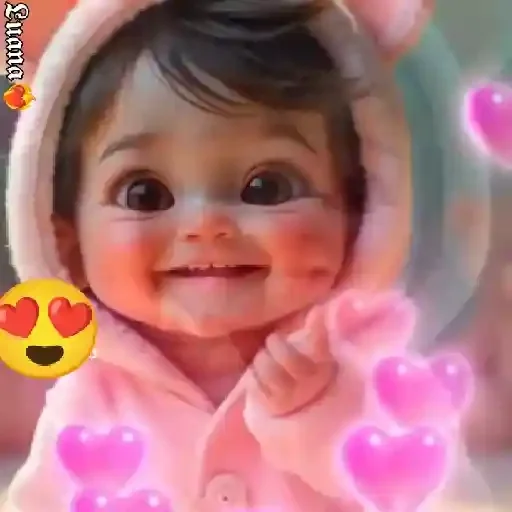 Menina bebê com expressão feliz, usando um casaco rosa com capuz e orelhas de coelho. Círculos rosa e um emoji de coração aparecem ao redor.