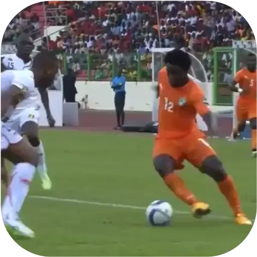 Jogador de futebol vestindo uniforme laranja dribla a bola em campo com adversário em branco ao lado, em estádio lotado.