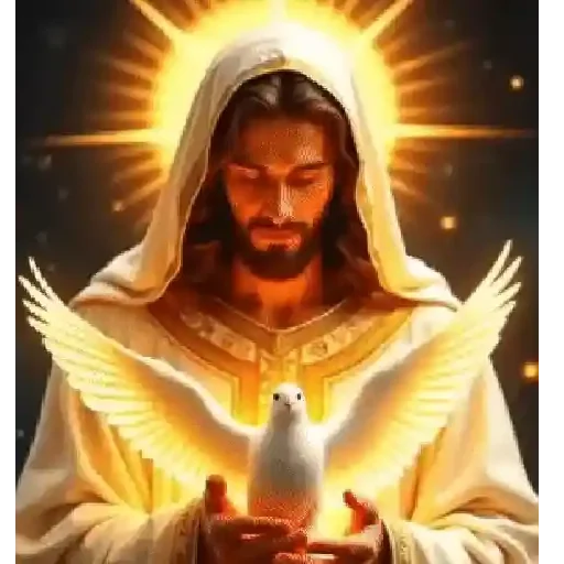 Imagem de Jesus Cristo com uma auréola luminosa, mãos estendidas segurando uma pomba branca, representando a paz e a divindade.