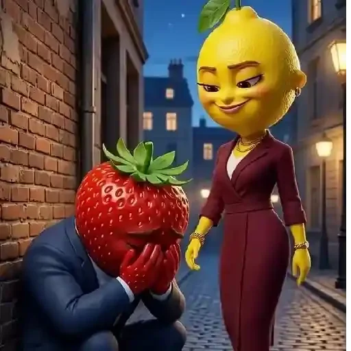 Um morango com um terno azul cobre o rosto com as mãos enquanto uma fruta amarela sorri ao lado em um beco à noite.