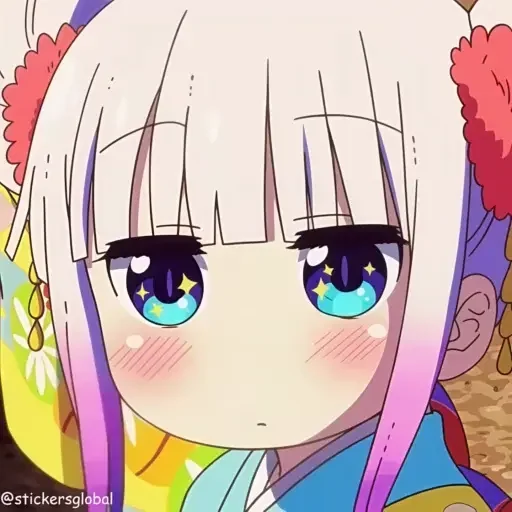 Rosto de uma menina de anime com cabelo branco e rosa, olhos azuis brilhantes e bochechas rosadas. Ela parece tímida ou surpresa.