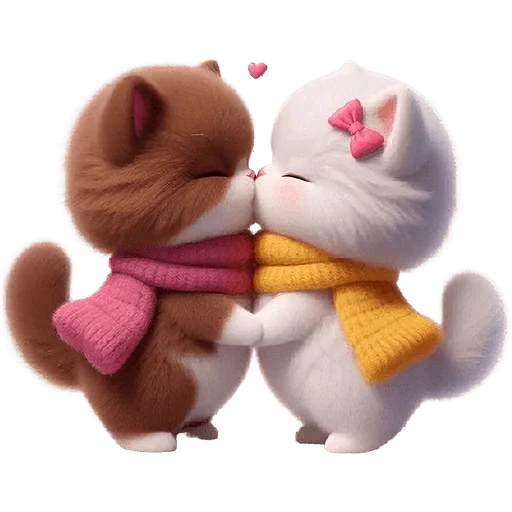 Dois gatos fofos, um castanho e um branco com laço rosa, se beijando. Eles estão usando cachecóis coloridos, o castanho usa um cachecol rosa e o branco um cachecol amarelo.