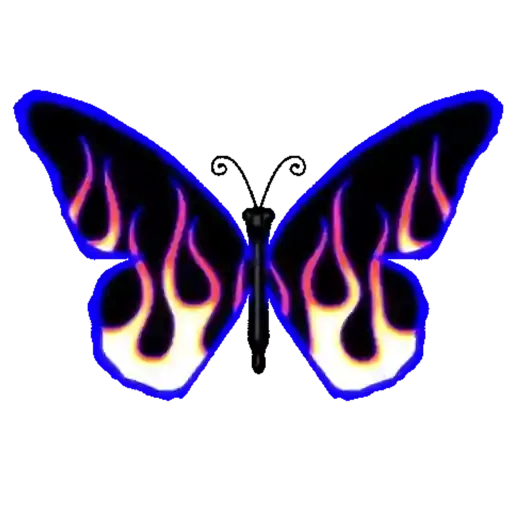 Borboleta com asas pretas e chamas coloridas em rosa, amarelo e laranja, com contorno azul.