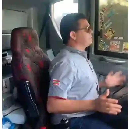 Um homem de meia-idade, com cabelo preto e óculos, sentado em um assento de ônibus ou caminhão, com as mãos levantadas como se estivesse explicando algo.