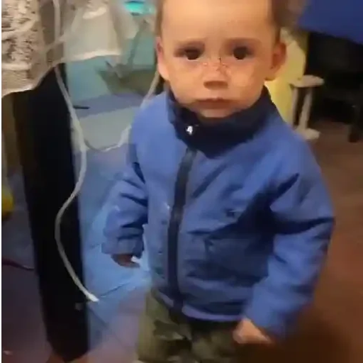 Menino pequeno com jaqueta azul e expressão séria, ao lado de um objeto com corda branca.