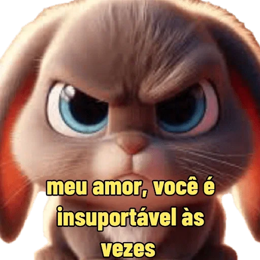 Um coelho com expressão séria e olhos azuis, com texto amarelo sobreposto: 'meu amor, você é insuportável às vezes'.