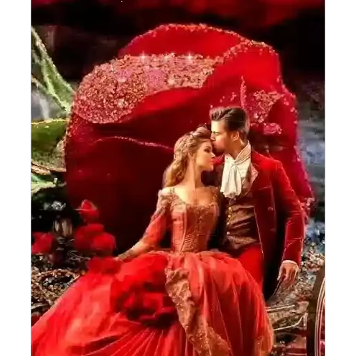 Casal se beijando em frente a uma rosa gigante vermelha, com o homem vestindo um terno vermelho e a mulher um vestido vermelho longo.