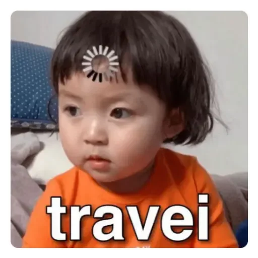 Menino asiático com franja, usando uma tiara de sol, com uma expressão neutra e a palavra 'travei' embaixo.