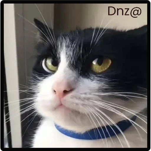 Gato preto e branco com colar azul, olhos verdes e a legenda 'Dnz@'
