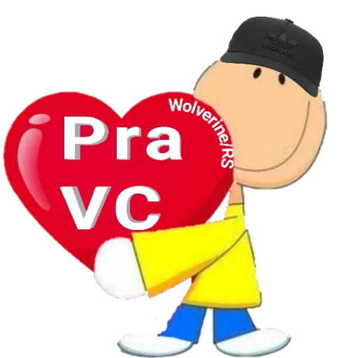 Um menino de boné preto e camisa amarela segura um coração vermelho gigante com 'Pra VC' escrito em branco. O coração também tem 'WolverineRS' em letras pequenas.