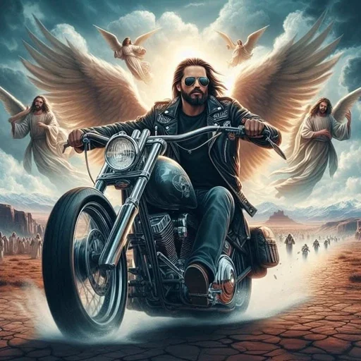 Um homem barbudo com óculos de sol anda de moto em uma estrada de terra, com anjos alados ao fundo e uma auréola de luz.