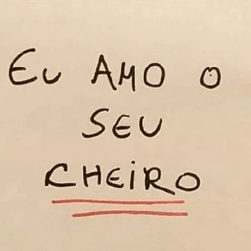 Um fundo bege com texto manuscrito em preto: 'Eu amo o seu cheiro'. Abaixo do texto, há dois riscos vermelhos.