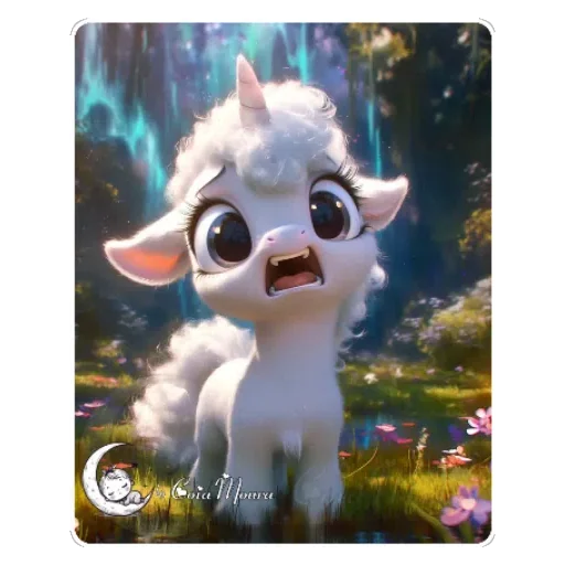 Um filhote de cordeiro branco com olhos grandes e expressivos, em um campo com flores, com uma expressão surpresa ou assustada. Fundo com efeito de luz azul.